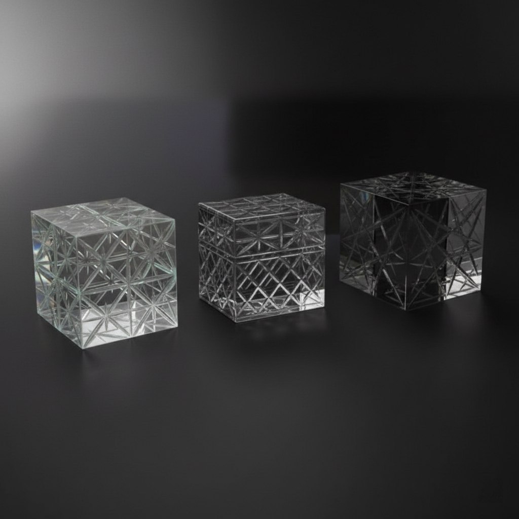 Geometric toys , Sheet glass, UV bonding, diamond cutting, 3 ? (10?10x10) cm