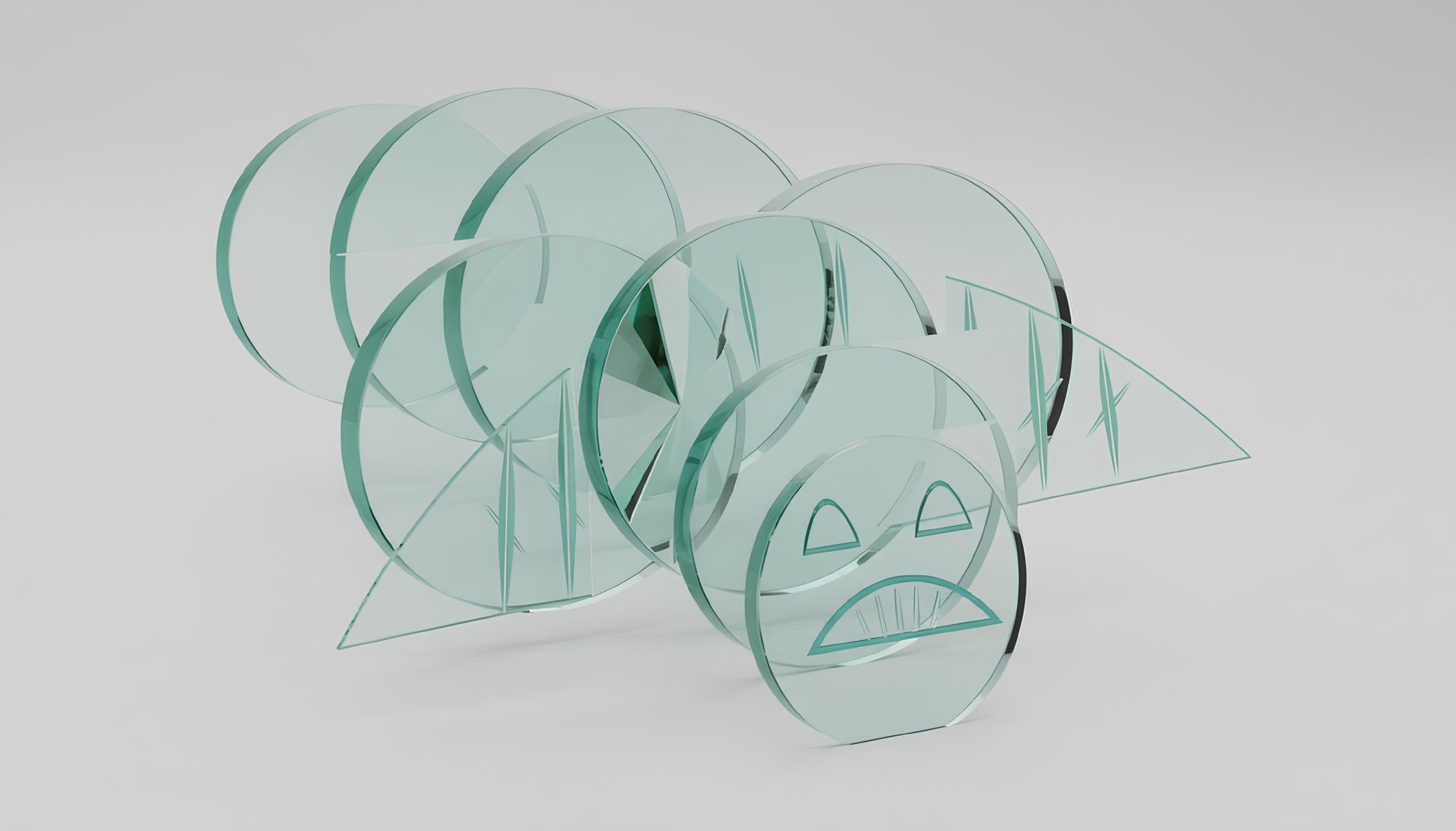 Trio from the series Symphony of Glass , sheet glass, UV bonding, diamond engraving,© Irina Levina, 2023; photo credit © by Ekaterina Kruglova