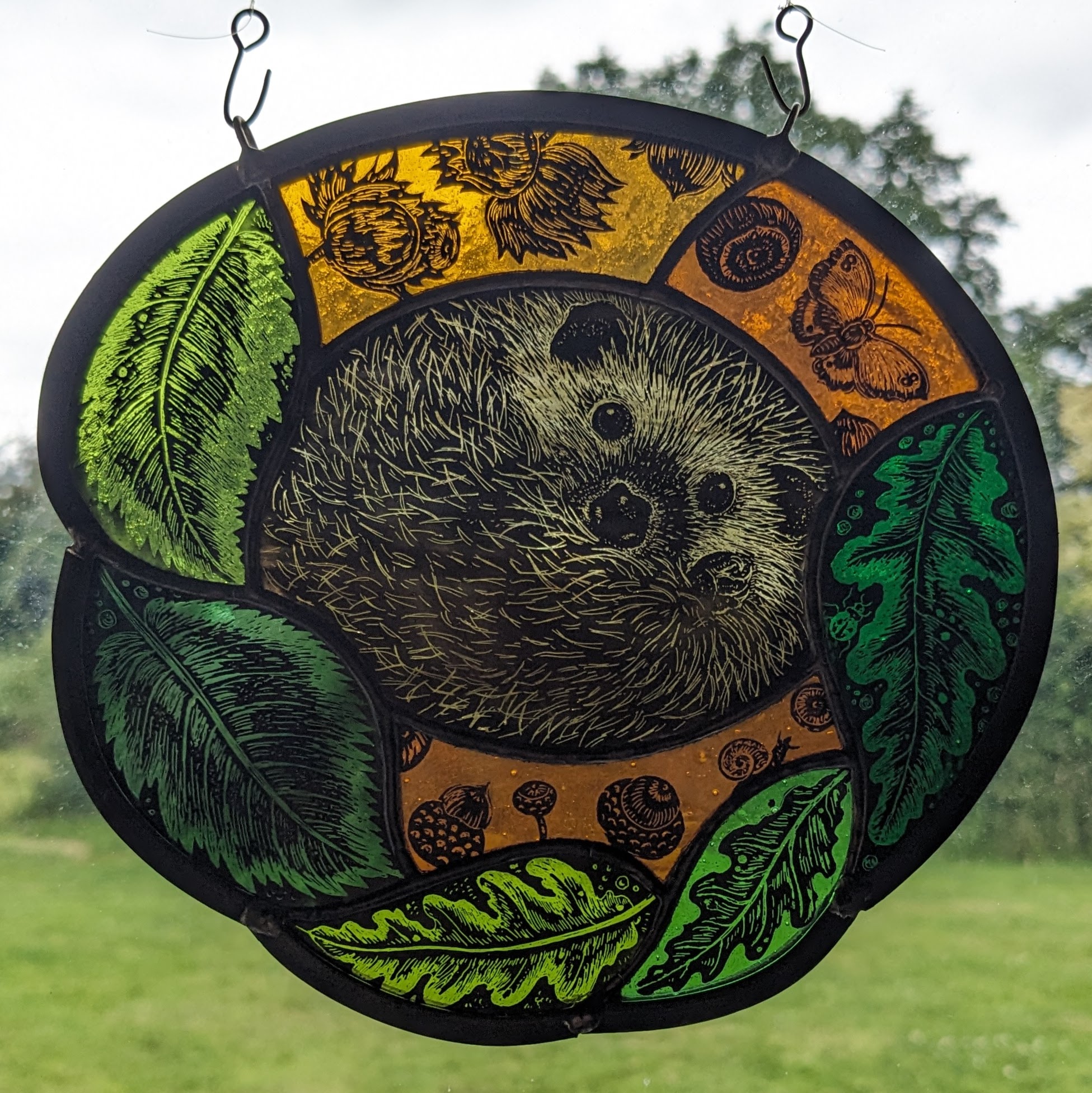 She now works and teaches from her Worcestershire studio. Using traditional glass painting methods ,such as sgraffito, and the Tiffany technique Liz produces panels featuring British flora and fauna and the countryside around her home.