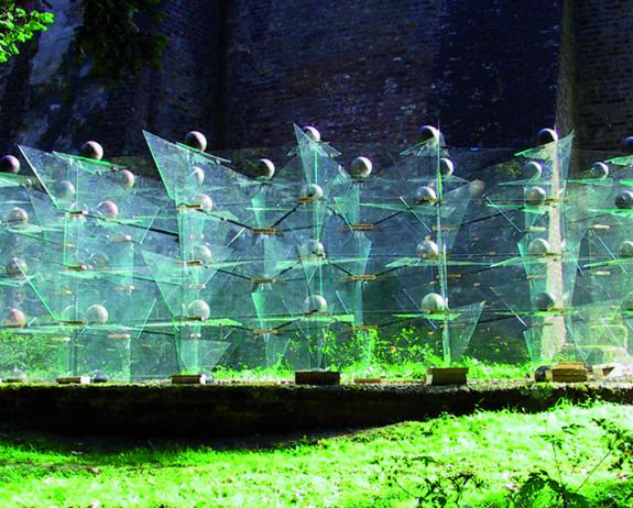 A 1 metre suspended cube which comprises five layers of lacy fused, slumped glass and sandblasted glass.